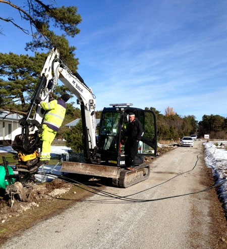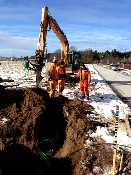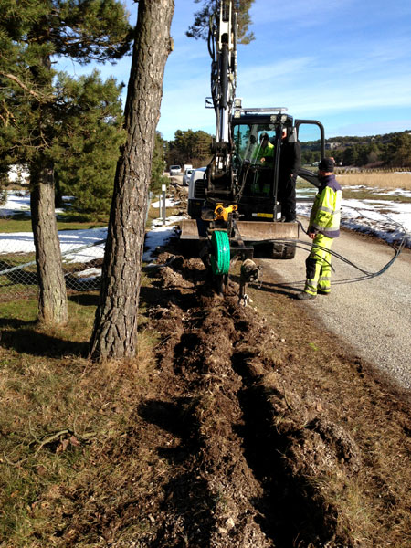 Efter många kilometer grävning fungerar samarbetet med grävning och matning av slang perfekt. |