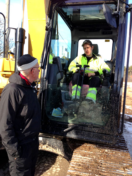 Samspråk med områdessamordnare Lasse Söderlind. Grävaren är klar i Brunnskog och på väg till Klintegårda. |