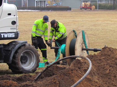 Fiberslangen förebereds för indragning under vägen. |