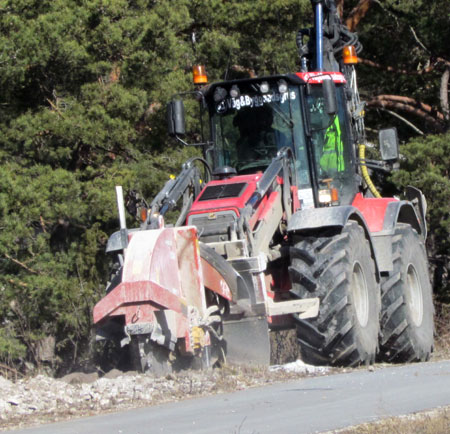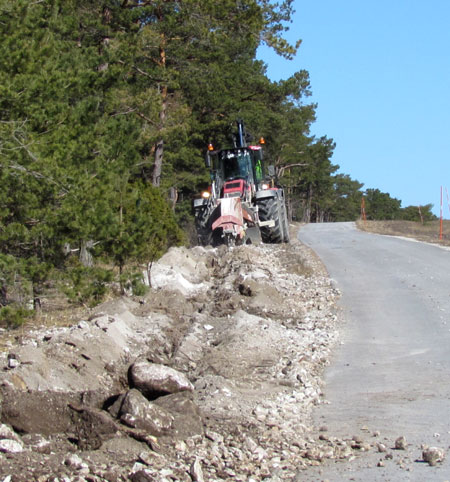 Marken är bergig och stenig. Traktorn fräser ett spår lämpligt för fiberslangen. |