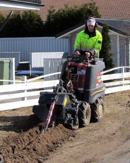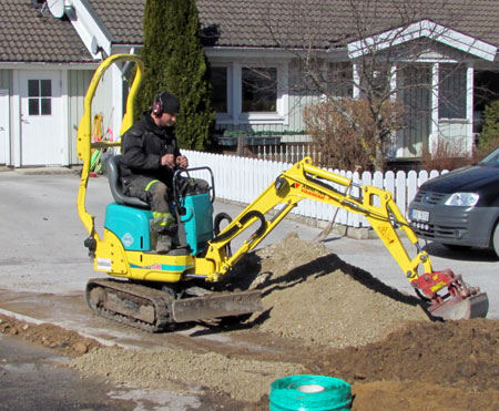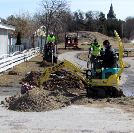Minigrävaren får det att lysa i varje mans öga, oavsett ålder. Här igång med att fylla igen kabeldiket. |