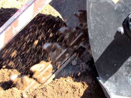 Kedjegrävaren i full aktion. Kedjan med stålspetsarna gäver sig genom den tjälhårda marken. |