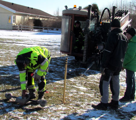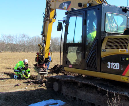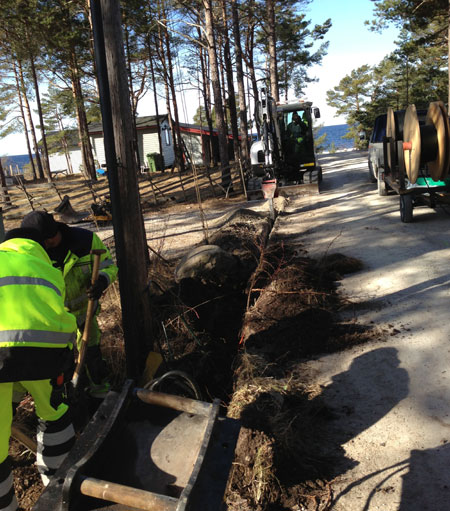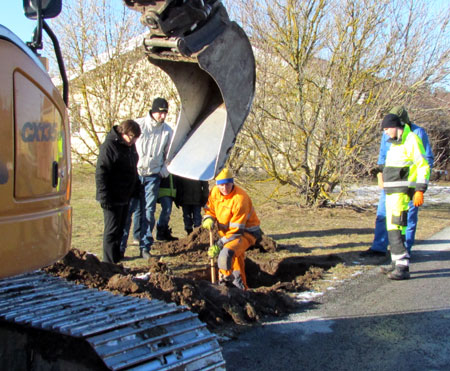 Korsande ledningar friläggs för säker hantering och beredning av plats för fiberslangen som läggs djupare. Hantlangare från skolan deltar aktivt i arbetet. |