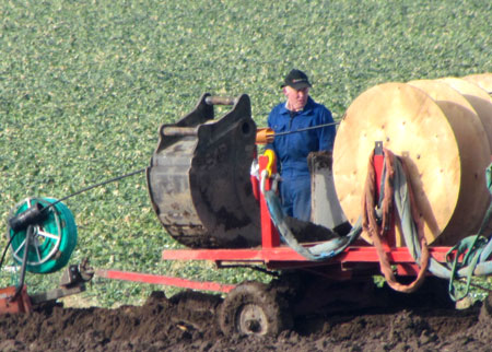Den lösa och blöta jorden gör det nästan omöjligt att gräva. Jorden packar sig i hjul och band. |